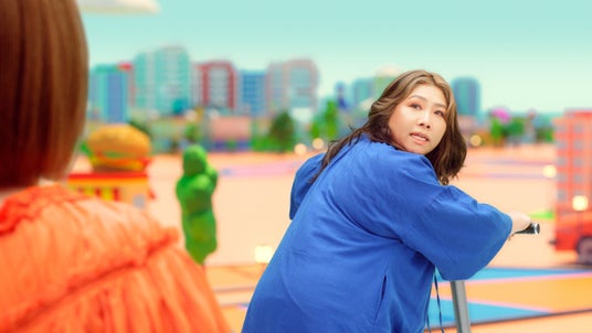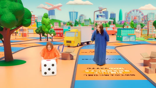 様々なライフステージが書かれた、巨大なすごろくの上にいる、やすよさんとともこさん。