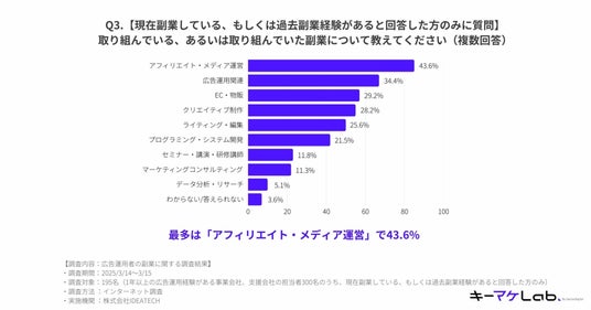 - 取り組んでいる、あるいは取り組んでいた副業としては、「アフィリエイト・メディア運営」が最多で43.6%。次点が「広告運用関連」で34.4%、「EC・物販」で29.2%。