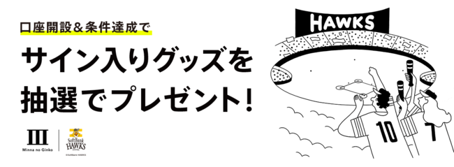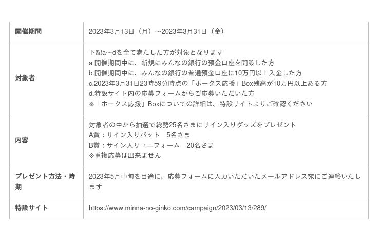本日より、2023年度における福岡ソフトバンクホークスとのタイアップキャンペーンの第1弾として、みんなの銀行に新たに預金口座を開設された方のうち、特定条件を満たした『「ホークス応援」Box』を作成・入金されたお客さまを対象に、選手のサイン入りグッズが当たるキャンペーンを実施します。