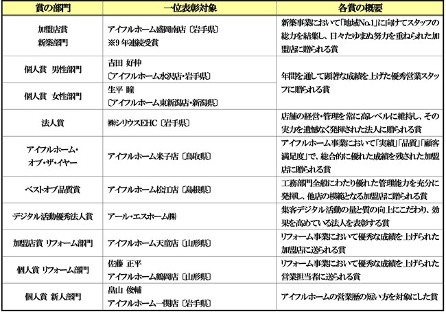 ベストオブ品質賞はアイフルホーム松江店が、アイフルホーム・オブ・ザ・イヤーはアイフルホーム米子店が受賞。加盟店賞 新築部門は、アイフルホーム盛岡南店が9連覇を達成しました。さらに、デジタル集客活動に力を入れていることから、今年度からデジタル活動優秀法人賞を新設し、アール・エスホーム((株)(徳島北店G)が1位となりました。なお、2022年度の各種コンテストの受賞者・受賞店は次頁の通りです。