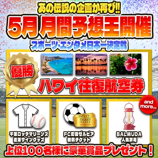 1位はハワイ往復航空券!100位+キリ番順位までもれなく豪華賞品!ユーザーが月間ランキングで争う特別企画『月間予想王』開催中!
