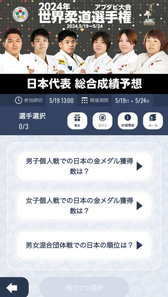 大会初日~5日目に行われる個人戦の各階級の優勝選手や、大会最終日の男女混合団体戦のベスト4&優勝国と日本の最終順位、そして本大会を通じた日本代表の金メダル獲得数や成績を予想する内容となっています。