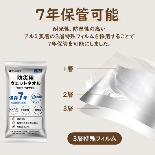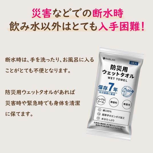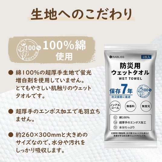 ノンアルコールで無蛍光・無香料・無着色、綿100%の超厚手生地!水分をたっぷり含んだまま長期保管が可能な防災用品です。