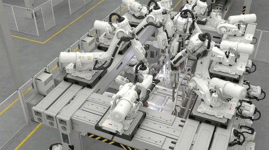次世代ロボットの包括的なラインアップは、工場のパフォーマンスをより最適化するため、連携して動作するように展開されています。例えば、10台のIRB 6730SまたはIRB 6750S棚置き型ロボットが、8台のIRB 6710~IRB 6740床置き型ロボットと協調して作業することで、車体のスポット溶接数を15秒間で70箇所から80箇所に増加させることができます。さらに、画期的なモジュール設計によってスペアパーツやサービスツールを共有することが可能で、これによりトータルコストの削減にも貢献します。