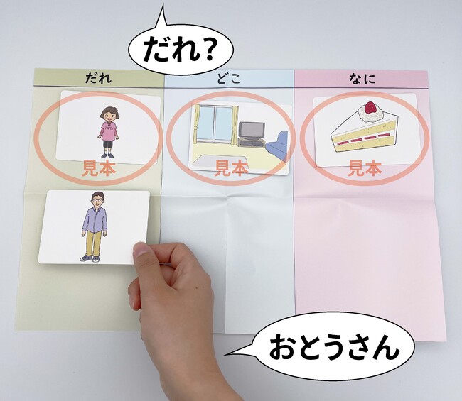 【だれ・どこ・なにシート】を机の上に置きます。【だれカード】【どこカード】【なにカード】を1枚ずつ
