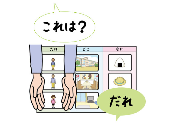 このカードは自閉スペクトラム症をはじめとする神経発達症(発達障害、知的障害)のある子どもが、「だれ・どこ・なに」という疑問詞に適切に答えられるようになることを目指す学習教材です。