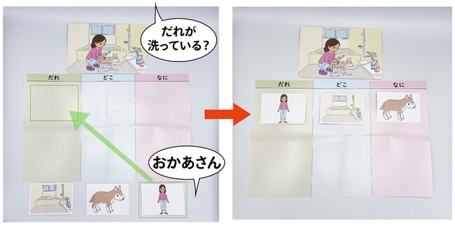 【場面カード】の中の人物を指差しながら、「だれが~している?(写真の例ならだれが洗っている?)」と質問します。「おかあさん」と答えさせながら、おかあさんの【だれカード】をシートの「だれ欄」に置かせます。