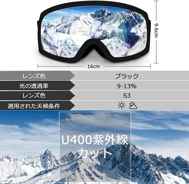 【UV400による安心保護】スキー場は、雪への反射や標高の高さから紫外線量が多いため、UVカット機能の付いたゴーグルであれば、目へのダメージを軽減することも可能です。