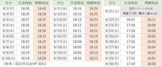 当館は瀬戸内海に隣接しており、暑さが少しずつ和らいでくる秋は、夕景のベストシーズンとなります。皆さまに少しでも長い時間、美しい景色を楽しんでいただきたいと思い、通常は18時閉館のところ、日没10分後まで営業時間を延長します。