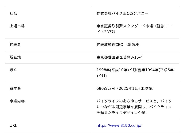 株式会社バイク王&カンパニーは、1994年9月に創業。中古バイクの買取・販売を主力事業とし全国に店舗を展開するほか、バイクの整備・パーツ販売・レンタルなど、バイクライフを総合的にサポートしています。近年は、バイクだけでなく電動モビリティなど、バイクライフを超えた幅広いモビリティ関連事業へと領域を拡大しています。