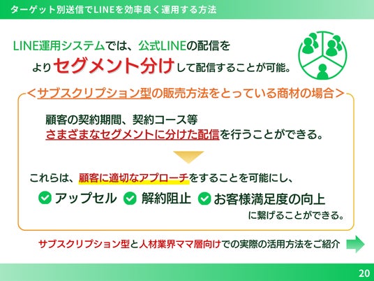 また、LINE運用システムでは、より詳細にセグメント分けした公式LINEからのメッセージ配信が可能です。例えば、サブスクリプション型商材の場合、顧客の契約期間、契約コース等さまざまなセグメントに分けた配信を定常送信することもできます。これらは、顧客毎の適切なアプローチを可能にし、アップセルや解約阻止、お客様満足度の向上に寄与します。特に、ママ層に向けて、育児用品の定期購入や季節ごとの子ども向け商品情報を提供することで、信頼関係も築きやすくなります。