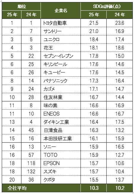 最も評価が高かった企業はトヨタ自動車で21.5点となり、6年連続1位となった。同社はSDGsに「本格的に取り組んでいる」の回答が15.0%、「少し取り組んでいる」が20.1%と、計35.1%の回答者が同社の取組を評価しており、この割合は300社の中で最も多い。