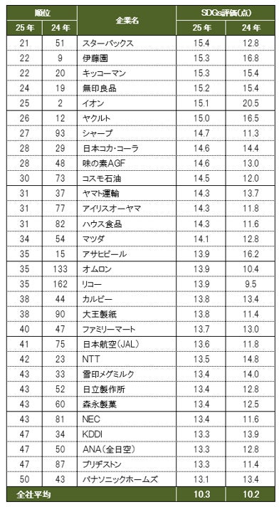 SDGs企業ランキング21~50位 出典:「企業版SDGs調査2025」(ブランド総合研究所)
