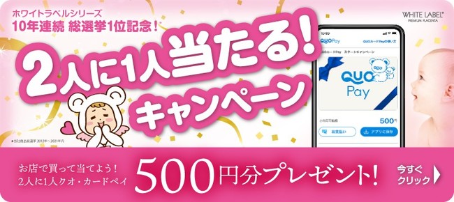 お店で「ホワイトラベルシリーズ」対象商品を購入後、レシート画像を撮影して応募すると、2人に1人クオ・カードペイ500円分をプレゼント!