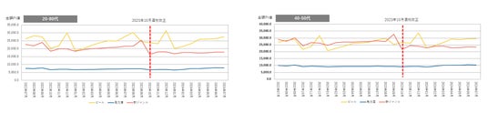 図3 ビール、発泡酒、新ジャンルの金額PI値推移(20代~80代)(40代~50代)