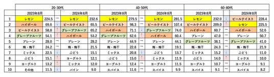 近年人気が拡大しているRTD市場において、世代や昨年との比較によって人気フレーバーに違いがあるのかを分析しました。(図1)。結果、2023年8月と2024年8月の平均購入金額(RTD類・ノンアルコール飲料購入者1人あたり購入額)を世代別で見てみると、「レモン」は全世代を通して両年ともに高い値を出し、上位にランクインしていることから、人気があり定番フレーバーとして定着していることがうかがえます。