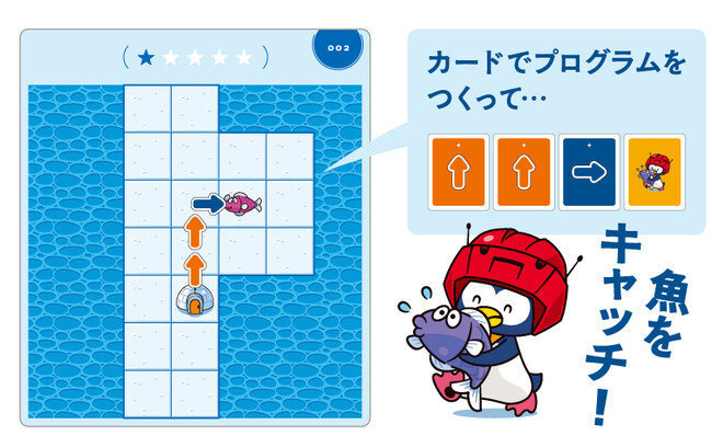 ペンギンのキャラクターたちを動かして、ステージをひとつひとつをクリアしていくゲーム感覚で、遊びながらプログラミングに必要な「組み合わせ」「パターン化」「シミュレーション」の3つの考え方が身につきます。