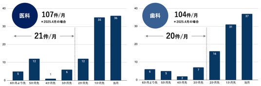 SCUELの「開業前事業所データセット」は、公開されている求人情報をもとに収集。2025年5月時点では、厚生局の開業届より前に、医科・歯科それぞれ100件以上の開業予定を把握しており、そのうち約20件は3か月以上先の予定情報です。