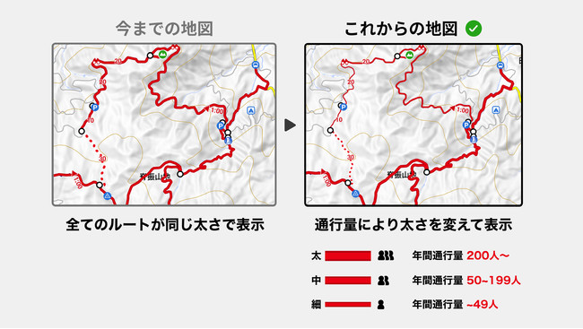 今回は、この赤い線をさらに細分化。登山者が多いルートは太く、少ないルートは細く表示し、太さを3段階※3に分けることで、登山ルートの通行量を可視化できるようにしています。