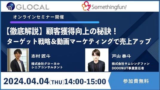 地域の中小・中核企業を対象に経営コンサルティング事業を行う株式会社グローカル(東京都渋谷区、代表取締役:浅野道人)は、動画を使ったDXを提案する株式会社サムシングファン(大阪府大阪市、代表取締役社長:薮本直樹)と、動画を活用した顧客獲得方法を解説する無料オンラインセミナーを、2024年4月4日(木)14:00~15:00に開催します。