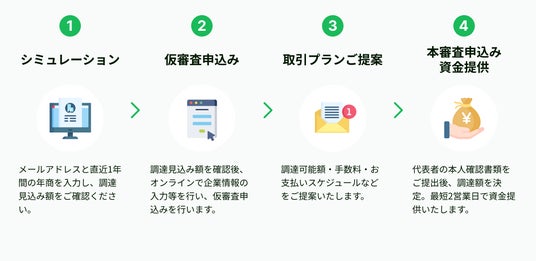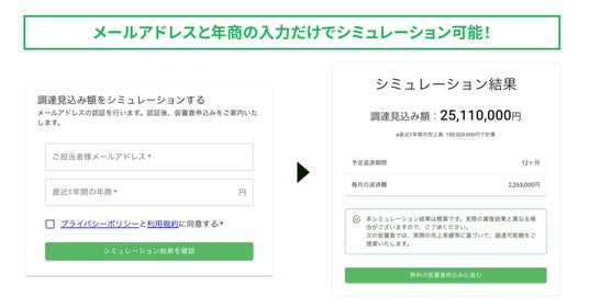 これまでは仮審査申込みを行わなければ、調達見込み額が確認できませんでしたが、メールアドレスと直近1年間の年商を入力するだけで、概算の調達見込み額を確認できるようになりました。