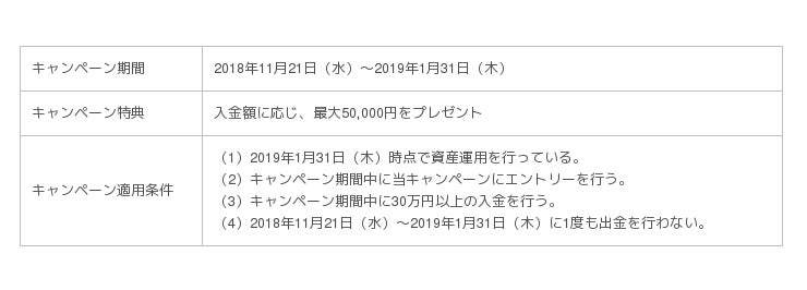 今回のキャンペーン(18年11月21日~19年1月31日)では、キャンペーン期間中にエントリーを行い、「WealthNavi for 住信SBIネット銀行」の口座に30万円以上を入金するなど、条件を満たしたお客さまを対象に最大50,000円をプレゼントいたします。