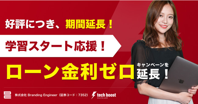 株式会社Branding Engineer(所在地:東京都渋谷区、代表取締役CEO:河端保志、代表取締役COO:高原克弥、証券コード:7352、以下Branding Engineer)は、運営するプログラミングスクールtech boost(以下、tech boost)にて、従前より実施しておりましたローンをご利用して入学いただく方向けの金利ゼロキャンペーンにつきまして、好評につきキャンペーン期間を延長することをお知らせいたします。