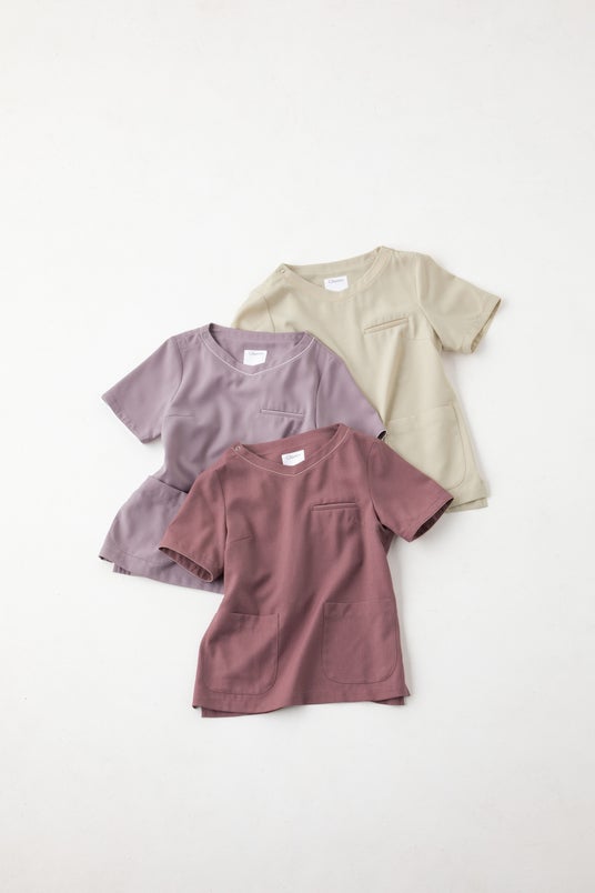 スクラブは「毎日着るユニフォームだからこそ、自分らしくおしゃれな雰囲気を大切にしたい」という彼女の想いを込め、優しい色合いの赤みのあるブラウン系「ココア」と温かみを感じさせる「アイボリー」の2色を追加、前回人気のあった「パープル」「ブルー」「ベージュ」と合わせて5色で展開する。