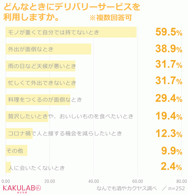 では、どんなときにデリバリーを利用するのでしょうか。複数回答可で聞いてみたところ、最も多かったのは「モノが重くて自分では持てないとき」で60%、次いで「外出が面倒なとき」で39%、「雨の日など天候が悪いとき」と「忙しくて外出できないとき」が32%でした。