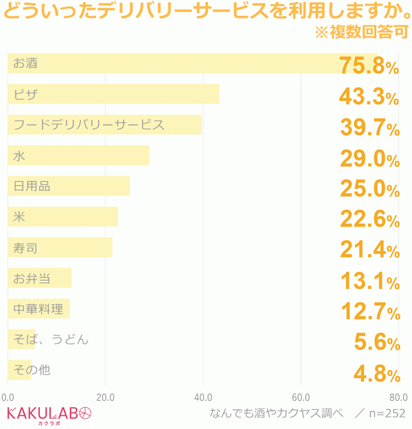 次に、どんなデリバリーを利用しているかを複数回答可で聞いてみたところ、圧倒的に多かったのは「お酒」で76%、カクヤスユーザーらしい結果となりました。次いで「ピザ」が43%、複数の飲食店からメニューを選べる「フードデリバリーサービス」が40%と続きます。「水」や「米」、「日用品」などの重くてかさばるものをデリバリーしてもらう人も多く、出前の定番だった「そば、うどん」よりもポイントが高いのは興味深いところです。
