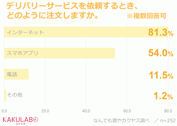 ちなみに、デリバリーを利用するとき、どのように注文するかを複数回答可で聞いてみたところ、「インターネット」が81%、「スマホアプリ」が54%で、「電話」は12%にとどまりました。かつてはピザも寿司も「電話1本でお届け」が謳い文句でしたが、いまやネットが主流。「フードデリバリーサービス」もアプリをインストールしなければ注文できない場合もあります。デリバリーの常識は変わりつつあるようです。
