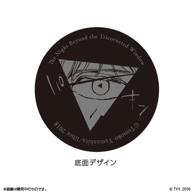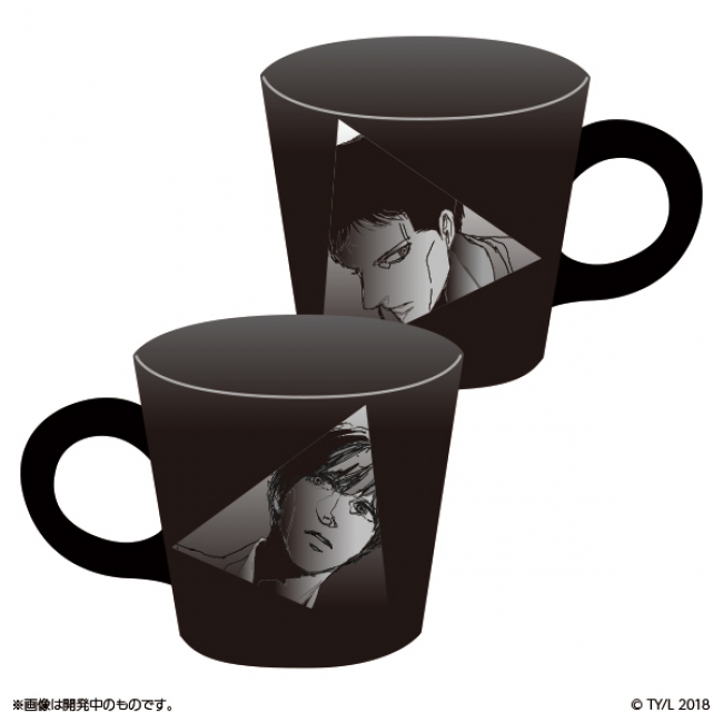 三角形に切り取られた三角と冷川の鋭い表情を、表裏にあしらった黒いマグカップです。カップの底面には冷川の目をプリント。折り紙の銀のような、印象的にキラリと光るインクで、クールな印象に仕上げました。