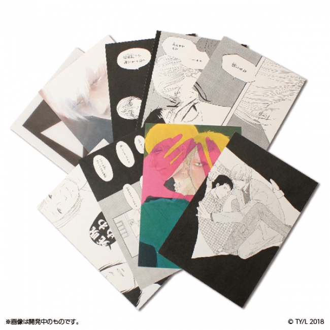 三角形がプリントされたトレーシングペーパーの封筒に入った、ポストカード8枚セットです。作中の印象的なシーンや、カラーイラストを起用したポストカードが、封筒越しにうっすらと顔を見せる仕様に。送るのはもちろん、飾ってもお楽しみいただけます。