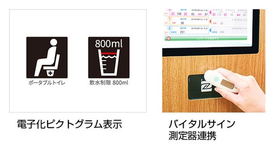 また、「バイタルデータ入力・電子カルテ自動連携機能」では、NFC式*測定器(体温計や血圧計など)をユカリアタッチにかざすだけで電子カルテにバイタルサインが自動連携・登録されるため、データの未入力、誤入力、入力までのタイムラグ発生防止に繋がっています。