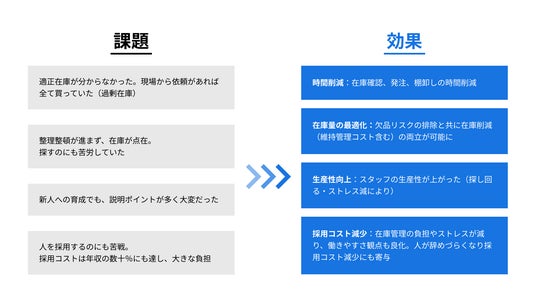 スマートマットクラウドを導入することで、在庫の見える化による適正在庫の把握と働き方改革が期待され導入に至りました。