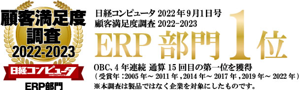 勘定奉行・奉行クラウドをはじめとする基幹業務システムを開発・販売する株式会社オービックビジネスコンサルタント(代表取締役社長:和田 成史/本社:東京都新宿区/以下OBC)は、IT製品とサービスを提供するベンダーへの評価を調べた、日経コンピュータ2022年9月1日号、顧客満足度調査2022-2023 ERP部門において、第1位を獲得しました。※上記調査は、製品ではなく企業を対象にしたものです。
