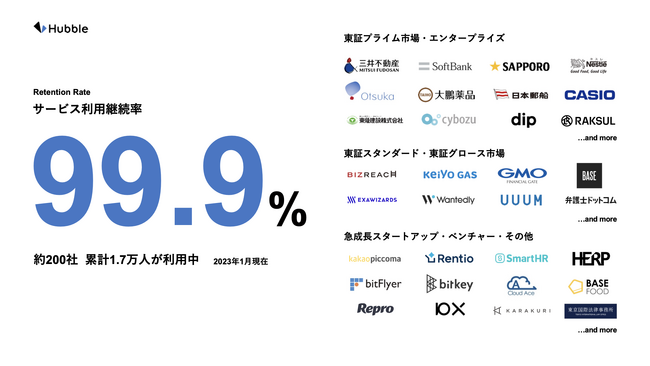契約書管理クラウドサービス「Hubble」は、急成長ベンチャー・スタートアップから東証プライム上場企業まで、業界規模を問わず200社超の企業に導入いただいております。とりわけ、ベンチャー・スタートアップにおいてはご利用率が高く、契約書管理クラウドとして広く認知されています。また、サービス利用継続率は99.9%※と、多くの企業で長くご利用いただいていることも特徴です。(※2023年1月現在)