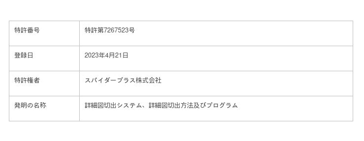建設DXサービス「SPIDERPLUS」を提供するスパイダープラス株式会社(以下「当社」)は、基本特許「詳細図自動切り出しAI」(以下「本発明」)を業界で初めて取得したことを発表いたします。