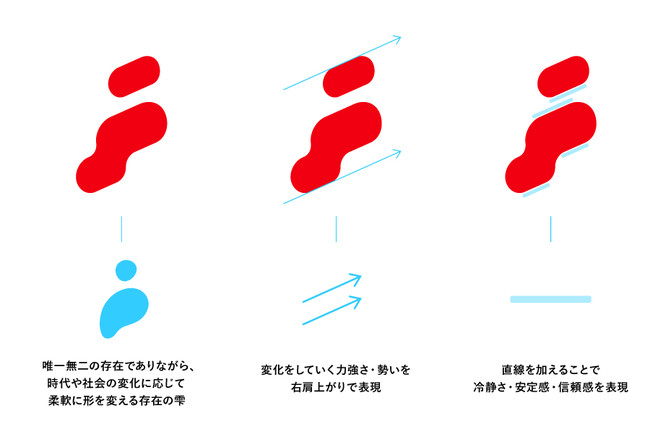 また、カラーはこれまでと同じ赤色を使用。これまで培ってきたご縁や信頼を受け継いでいくという意思を表現しています。そして、ロゴ全体を右肩上がりにすることで、変化していく勢い・力強さも表しています。