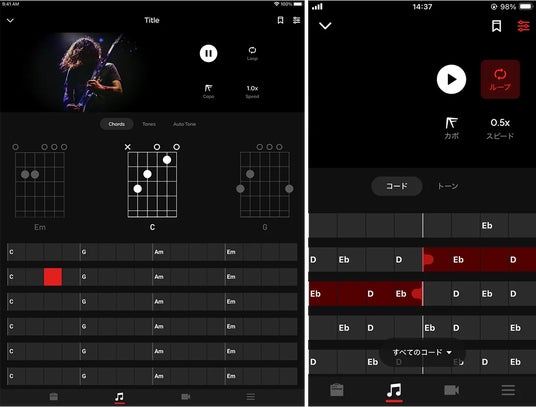 ほしいスコアはYouTubeでアプリ上でYouTubeを開けばスコアの宝庫に早変わり。コードをリアルタイムで解析し表示します。さらにトリッキーなセクションのテンポを下げてループ再生機能を使用すれば、かんたんな操作で誰でも直感的、かつ効果的な練習を行うことができます。