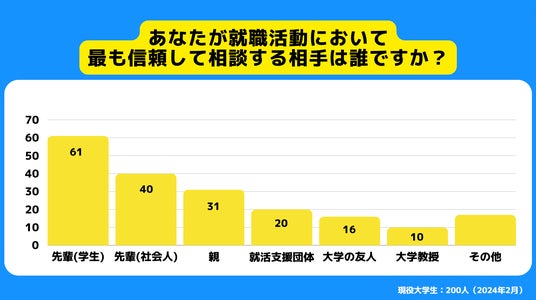 ■就活で最も信頼しているのは大学の先輩(学生)であると回答。