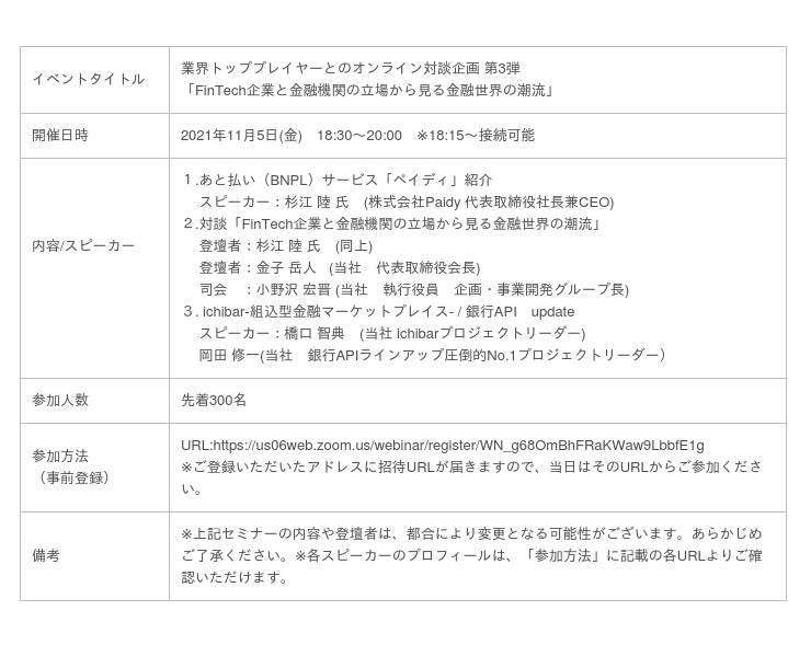 「FinTech企業と金融機関の立場から見る金融世界の潮流」と題して、日本を代表するユニコーン企業の株式会社 Paidy 代表取締役社長兼CEO 杉江 陸 氏をゲストにお迎えします。FinTech企業と金融機関双方の立場から、現在、国内外で見られる金融世界の潮流や変化のほか、その先に広がる未来の金融世界などについて、当社 代表取締役会長 金子 岳人と対談いたします。またイベントの最後に、現在当社が新たに取り組んでいる「ichibar(イチバー)-組込型金融マーケットプレイス-」(以下、「ichibar」)と銀行APIの最新情報を紹介いたします。