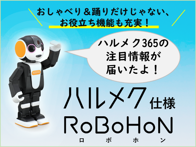 今回の実証実験では、シャープが提供するお話できるロボット「ロボホン」に、「ハルメク365」から届く更新情報を定期的にお知らせする機能を実装し、ロボホンおよびハルメク365の双方の利用を促す仕組みを提供していきます。実証実験期間中はハルメクからロボホン本体をお客様に貸与し、お客様は月額費用のみでご利用いただけます。