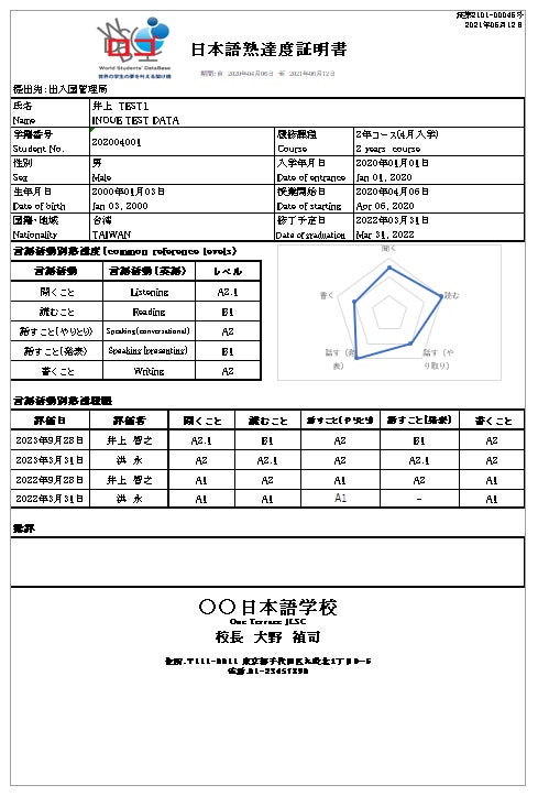 日本語教育機関の認定制度が施行され、授業科目の設定と授業科目に対する成績評価が求められる中、「教育機関が学習者に対してどのような授業(科目)を何時限行い、どのような評価を受けたのか」を証明するものを成績証明書と再定義をおこない、従来の学習者の技能を評価するものは、日本語能力の参照枠評価に特化した「日本語熟達度証明書」として発行することで、「教育機関としての証明」と「学習者の日本語能力の見える化」を実現しました。