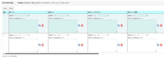 参照枠評価登録(学生への評価)学生には複数回の評価を行うことが可能です。成績評価と異なる機能とすることで、入学直後に学校が確認したレベルを入力することも可能です。