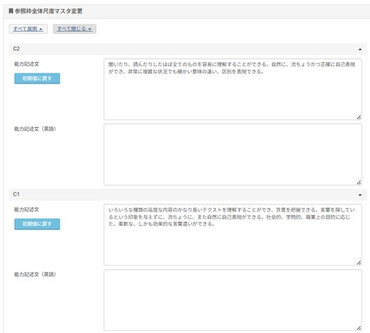 参照枠技能別マスタ技能別に、参照枠レベルごとに能力記述文、能力記述文(英語)設定できます。また、CERF補遺版で加わった詳細レベルを学校として利用するかどうかを技能ごとに設定できます。