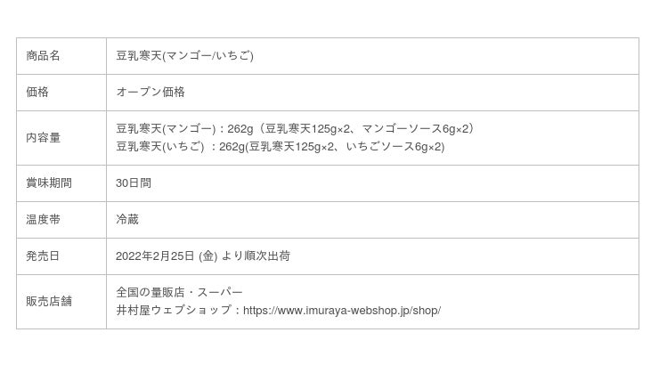 井村屋株式会社(本社:三重県津市高茶屋七丁目1番1号、社長:岩本 康)は、チルドの新商品として「豆乳寒天(マンゴー/いちご)」を2022年2月25日 (金) より全国にて発売いたします。