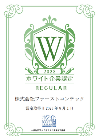 株式会社ファーストコンテック様が、一般財団法人日本次世代企業普及機構(通称:ホワイト財団)が運営する「ホワイト企業認定 レギュラーランク」を取得しましたことをお知らせいたします。