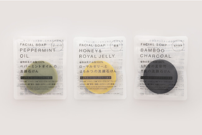 植物由来の油脂100%、名水の地 鳥取県大山の天然水を使っています。じっくり低温で一ヶ月以上熟成する非加熱製法(低温熟成コールドプロセス製法)で作られることで、熱に弱い美容成分を配合でき、洗顔後に肌がつっぱらず、やわらかな肌に仕上がります。ペパーミントオイル*が入ったピーリング*(左)、ローヤルゼリー*とはちみつ*の保湿(中央)、九州産の孟宗竹の竹炭*を配合した毛穴洗浄(右)、とお悩みにあわせて3種類を展開します。お肌へのやさしさを考えて、エデト酸塩、防腐剤、酸化防止剤、鉱物油、石油系界面活性剤は使用せず無添加にこだわりました。