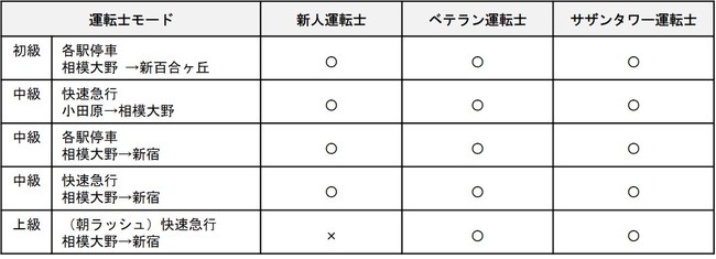 本シミュレーターには、小田急線の運転経験者が監修した独自の運転支援システムを採用しています。難しい知識を必要とせずハンドルの簡単操作のみで運転士気分が味わえる、とにかく運転してみたい小さなお子さまにおすすめの「新人運転士モード」、運転席での緊張感を楽しめる「ベテラン運転士モード」、車両計器や信号現示を頼りに実車さながらの運転に挑戦できる「サザンタワー運転士モード」と3つの難易度設定により、何度でも小田急線の運転を体験いただけることが特徴です。